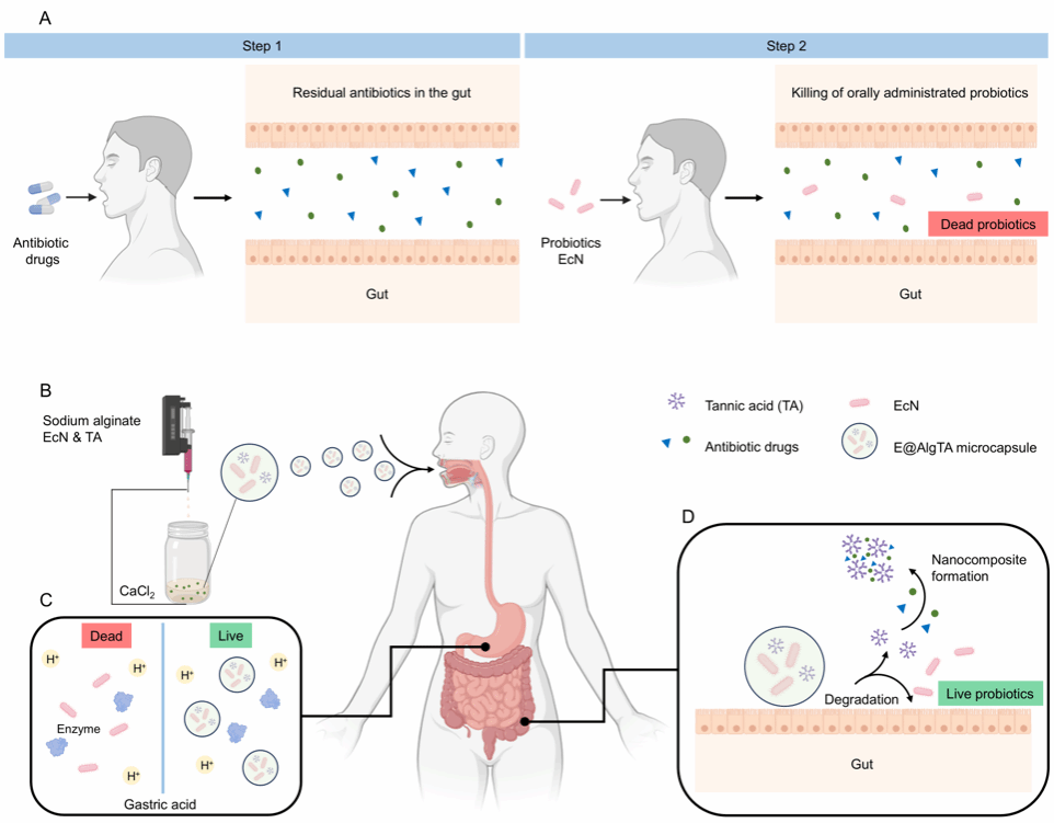 随着抗生素药物滥用,抗生素相关性腹泻(Antibiotic-associated diarrhea, AAD)的发病率呈逐年上升态势。口服益生菌可由多种途径恢复肠道稳态以改善AAD,但其实际应用面临两个挑战:肠道内大量抗生素残留严重削弱益生菌活性;胃肠道特定的生理环境(如胃酸、肠液等消化液)制约益生菌制剂的高效递送。本研究针对上述问题,基于天然多酚与抗生素分子之间的化学相互作用,提出多酚修饰水凝胶微球提升益生菌在抗生素逆境环境下存活率的新思路。采用静电喷雾法制备同时负载益生菌Escherichia coli Nissle 1917(EcN)和单宁酸(Tannic acid, TA)的海藻酸钙水凝胶微球E@AlgTA,系统研究了E@AlgTA的保护效果以及TA和抗生素之间相互作用的分子机制。结果表明:TA与抗生素分子之间通过pH响应的自组装形成纳米级复合物,有效降低了后者的游离浓度和对益生菌的杀伤效力,从而提升EcN的存活率。E@AlgTA极大提升了EcN在恶劣环境中的存活率,包括抗生素溶液、模拟胃液、模拟肠液。此外,E@AlgTA可显著提升EcN在小鼠胃肠道中的滞留和活力,有望进一步应用于AAD的治疗。