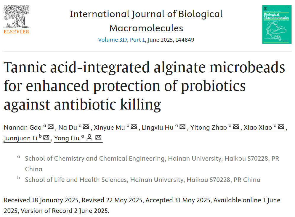 近日,International Journal of Biological Macromolecules期刊(中科院SCI二区Top期刊,IF = 7.7)在线发表题为“Tannic acid-integrated alginate microbeads for enhanced protection of probiotics against antibiotic killing”的研究论文。bevictor1946韦德官网应用化学专业三年级本科生高楠楠为论文第一作者,bevictor1946韦德官网刘用副教授为论文通讯作者。
