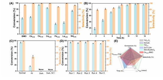 当Ce掺杂量为0.04 mmol时,催化性能最优,硝基苯转化率高达94 %,亚胺选择性接近100 %。最优性能的原因是不同摩尔量的Ce掺杂剂诱导产生的缺陷和活性位点的数量不同。摩尔量为0.04时,产生了最优浓度的氧空位和FLPs位点,有利于反应物的吸附和活化,表面氧空位和Ce位点也有利于光生电子-空穴对的分离。次表面Ce对底物分子的表界面吸附和载流子迁移的调控协同提升光催化性能。