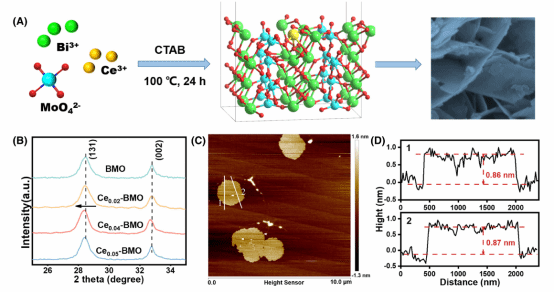 针对这一问题,本文通过原位水热法将Ce掺杂在单层Bi2MoO6纳米片的次表面,去探究次表面Ce掺杂剂在光催化中的作用。