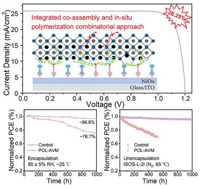 本研究提出了一种协同界面工程策略,通过共组装与原位聚合相结合的方式优化钙钛矿薄膜的埋底界面。具体而言,将11-巯基十一烷基磷酸(MPA)引入SAM体系构建共-SAMs,有效提高了NiOx表面的均匀性并减少了缺陷。同时,在钙钛矿前驱体中掺入离子液体(IL)单体1-烯丙基-3-乙烯基咪唑双(三氟甲基磺酰基)亚胺(AVMTF2)。IL阳离子在底部界面的聚集通过巯基端基引发原位聚合反应,在钙钛矿/SAM界面形成POL-AVM聚合物。该聚合物通过多重氢键强效锚定有机阳离子,不仅增强了界面粘附力,还调控了钙钛矿结晶过程并强化了结构完整性。基于此协同策略,器件实现了26.25%的冠军效率(认证效率26.04%),并在ISOS-L-2I标准下连续运行1000小时后仍保持95.6%的初始效率,展现出卓越的长期稳定性。