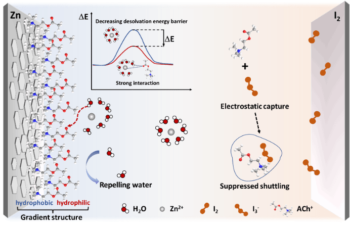 近日,bevictor1946韦德官网能源胶体与界面化学团队在《Advanced Science》上发表题为“Cation-Engineered Gradient Interfacial Structure toward Dendrite-Free and Shuttle-Free Aqueous Zn-Iodine Batteries”的研究论文。该研究提出了一种“双电层(EDL)定向调节”策略,利用两亲性乙酰胆碱阳离子(ACh)在电极-电解质界面构建了疏水-亲水梯度结构,实现了长寿命水系锌-碘电池。