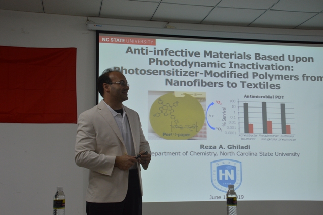 Reza A. Ghiladi教授为大家做了题为“Anti-infective Materials based upon Photodynamic Inactivation: Photosensitizer-Modified Polymers from Nanofibers to Textiles”的报告,报告中Ghiladi教授介绍了其从事抗感染材料研究的研究背景故事,并对其采用纤维素纸张、聚丙烯腈基/聚酰胺、烯烃共聚物、羊毛/丙烯酸复合织物等为基材,分别通过共价、静电纺丝、熔压、染整等手段制备光敏抗感染纤维材料的研究思路和研究结果进行了详细介绍。该领域的研究成果已在其联合创办的抗菌材料大学创业公司- PhotoCide Protection进行应用。此次报告引起公司师生的极大兴趣,报告会后,公司师生与Ghiladi教授进行了积极交流和热烈讨论。通过此次报告会,与会师生不但对Ghiladi教授在抗感染材料方面的工作成果有了较全面的了解,对其如何实现高新技术快速产业化也有了深刻的认识,其研究历程对公司师生未来科研工作具有很好的借鉴作用。