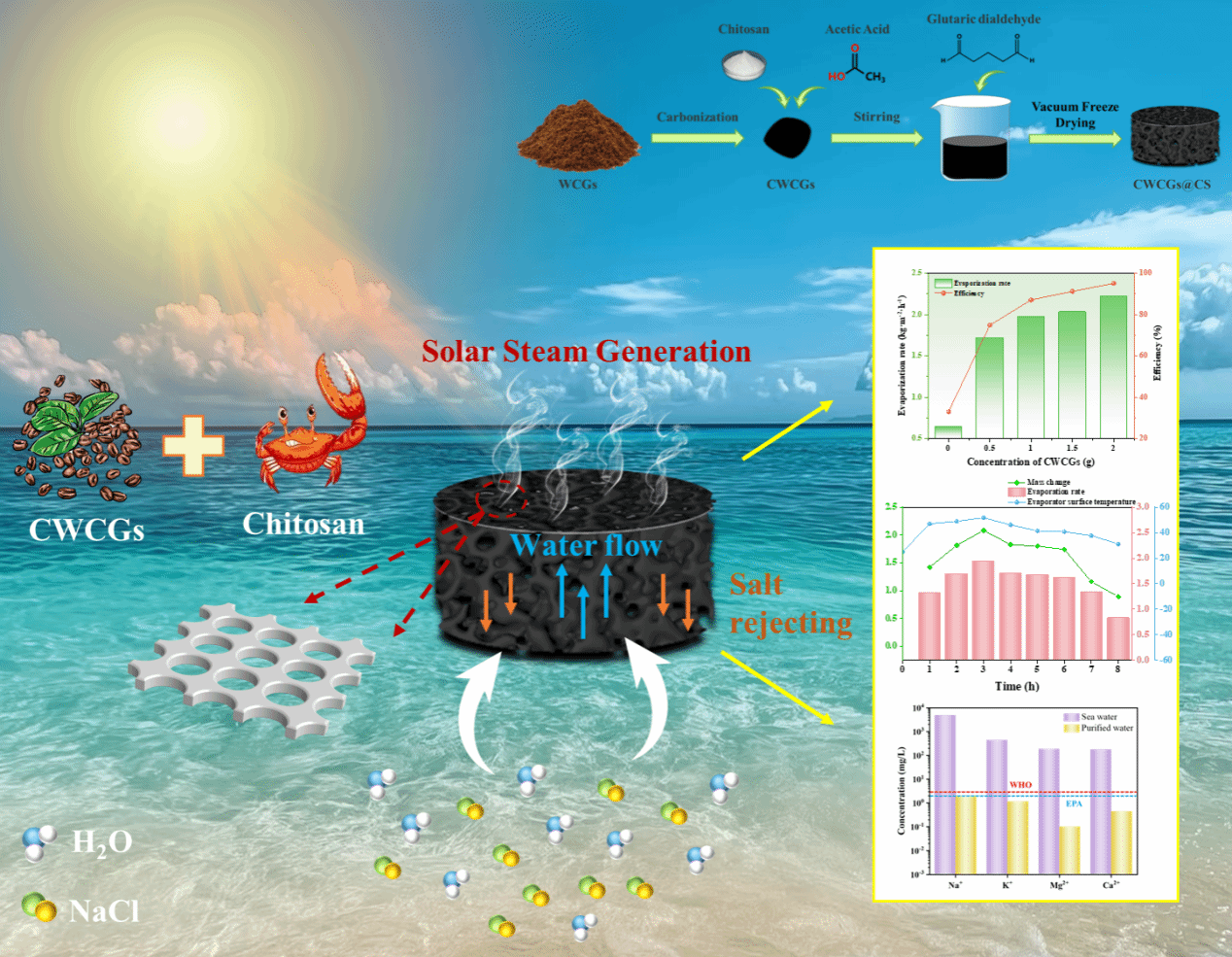以太阳能为驱动的海水淡化技术是解决当前淡水资源短缺问题的有效方法,但部分光热材料存在制备复杂、成本较高、对环境不友好等缺点,因此制备更加节能、便捷且绿色环保的光热材料是我们目前亟待解决的问题。本研究探讨了以废咖啡渣(CWCGs)为原材料,混合壳聚糖(CS),并以戊二醛为交联剂,通过真空冷冻干燥法合成多孔、高效光热转换性能的多孔(碳化咖啡渣)CWCGs@CS(壳聚糖)气凝胶。结果表明2-CWCGs@CS在一个太阳光照射下的蒸发速率可达2.24 kg·m−2·h−1,蒸发效率为95.12%。且该气凝胶还具有较好的耐久性及自清洁性能,可以减少盐结晶的出现。此外,还能实现海水淡化、强酸碱溶液及染料废水的净化。此项研究为解决全球水资源短缺问题提供新思路,并有望应用于大规模生产和实际工业中。