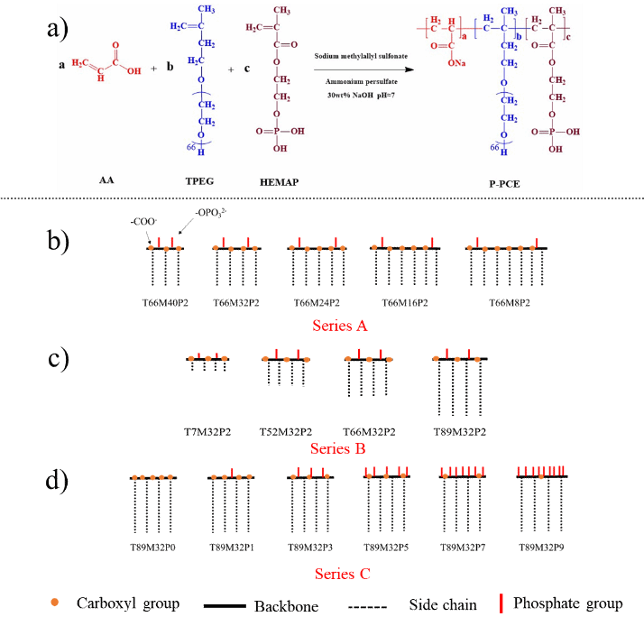 鉴于此,bevictor1946韦德官网潘莉莎教授团队提出 “络合吸附-马兰戈尼效应” 策略,引入2-羟乙基甲基丙烯酸酯磷酸酯(HEMAP)作为功能消泡单体,经过水溶液自由基聚合成功合成低引气型聚羧酸减水剂(P-PCE),并通过调节聚醚大单体的聚合度以及甲基丙烯磺酸钠(MAS)和HEMAP的摩尔比对P-PCE的主链长度、侧链长度和磷酸根密度进行调控,其反应方程式和结构示意图如图3所示。