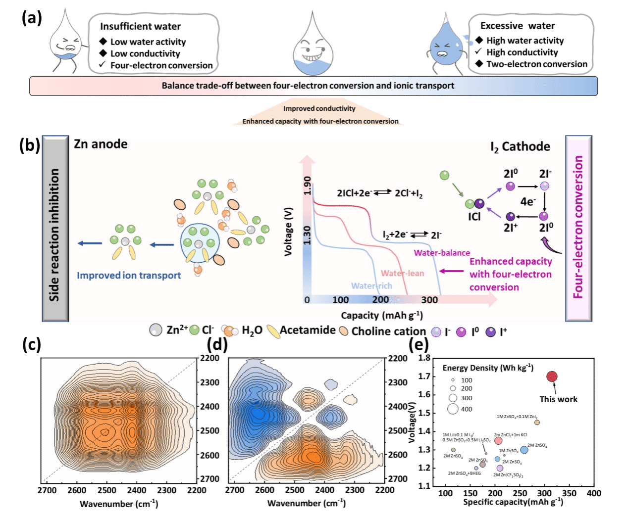 图1定量水环境分析、调控策略实现高性能水系Zn-I2电池。(a)水环境与离子传输、四电子转化关系示意图。(b)定制WiDES正、负极协同优化机制。二维红外(c)同步谱和(d)异步谱。(e)水系Zn-I2电池性能比较。