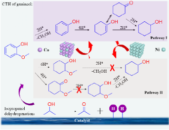 随着生物质精炼和绿色化工的快速发展,如何在温和、安全的条件下高效实现含氧芳香分子的脱氧转化,成为当前催化界的重要研究方向。愈创木酚作为木质素裂解的关键模型化合物,其选择性合成环己醇难度较大,因此本研究构建了一种由超薄 Co 基层状双金属氢氧化物(LDH)衍生的高效催化剂,用于愈创木酚催化转移加氢(CTH)加氢反应。通过调控 Ni/Co/Al 的金属比例与 LDH 前驱体的纳米结构,成功制备出分散性高、金属协同作用的 Ni–Co 催化体系。研究表明,在180 ℃且无需外加氢气的温和条件下,本文制备的 Ni0.1Co3.9Al1 催化剂能够高效催化愈创木酚的转移加氢反应,实现了接近100%的愈创木酚转化率与94%的环己醇选择性。在相似条件下,该催化体系的反应速率明显高于已报道的其他催化剂。研究发现,催化剂中 Ni 可促进芳环氢化,而 Co可促进愈创木酚甲氧基的断裂,两者协同实现了愈创木酚高选择性转化成环己醇。
