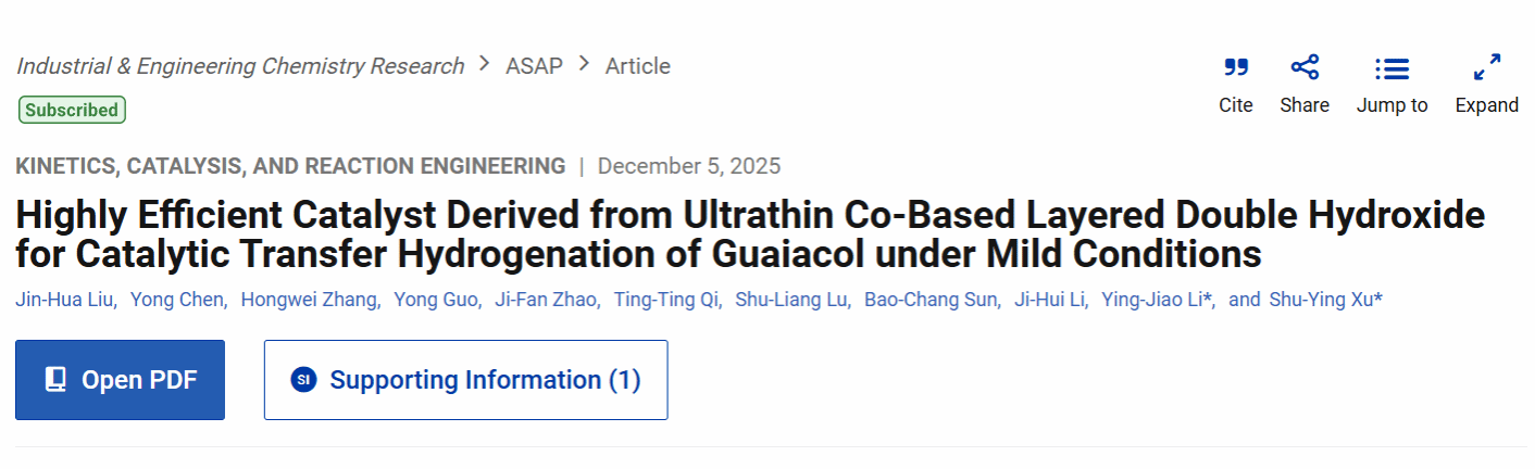 近日,化工三大刊之一 Industrial & Engineering Chemistry Research(IECR) 在线发表题为 “Highly Efficient Catalyst Derived from Ultrathin Co-Based Layered Double Hydroxide for Catalytic Transfer Hydrogenation of Guaiacol under Mild Conditions” 的研究论文。bevictor1946韦德官网化学工程与工艺专业2023级本科生刘锦华为论文第一作者,bevictor1946韦德官网李英教副研究员与徐树英教授为论文通讯作者。