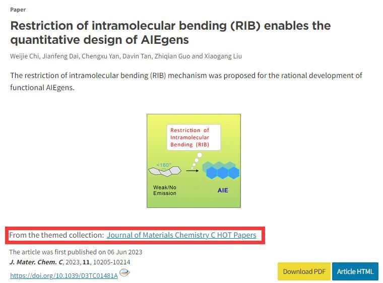 研究成果发表于国际著名期刊《J Mater Chem C》上,题为“Restriction of intramolecular bending (RIB) enables the quantitative design of AIEgens”,并被编辑选为热点文章。文章第一作者为bevictor1946韦德官网迟伟杰教授,通讯作者为华东理工大学郭志前教授、新加坡科技设计大学刘晓刚教授。