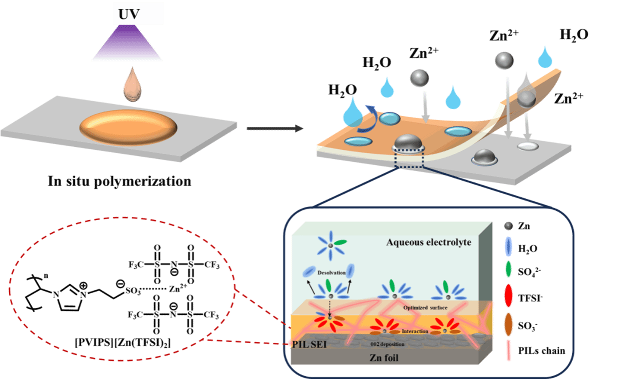 锌阳极的修饰是提高AZBs循环寿命的关键之一。为了解决锌阳极存在的枝晶、腐蚀等问题,研究者通过不断的努力,已经设计了一些有效的策略,例如:锌电极添加剂、电解质添加剂、涂层技术等。在众多策略中,通过表面工程构建人工固体电解质界面(SEI)被认为是一种简单、高效、可操作性强的方法。然而,疏水性强的SEI层虽能有效防止寄生反应的发生,但不利于电解质的润湿和锌离子的传输;亲锌性强的SEI层虽有利于载流子的传输,但是在耐腐蚀性能等方面不能完全满足要求。因此,如何平衡SEI层的疏水性和亲锌性成为一个难题。对此,本研究工作设计合成了一系列聚离子液体人工SEI层,并详细探究了聚离子液体SEI层疏水性和亲锌性变化对水系锌离子电池性能的影响机制,进而实现了二者在优化水系锌离子电池性能上的微妙平衡,为高性能水系锌离子电池中人工SEI层的优化提供了新的研究思路和依据。
