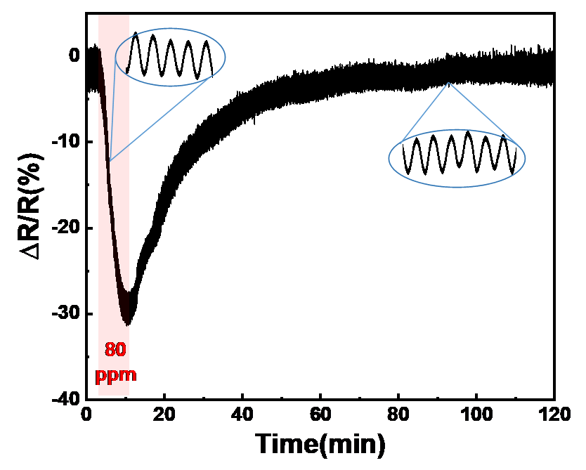 图5 Def-ZIF-8/PPY/ BC基柔性传感器在周期性弯曲应力(频率1.2 Hz,半径50 mm)下对80ppm NO2的实时响应曲线 (附图为周期性应力变化下的实时响应曲线)。