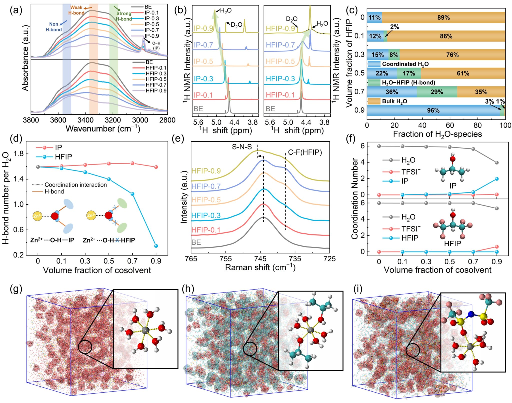 基于以上背景,bevictor1946韦德官网高新培教授和宁德时代21C实验室欧阳楚英教授合作提出了引入潜溶剂来构建含阴离子的溶剂化结构的策略,以提高水系锌电池中锌负极的稳定性。通过理论计算辅助,在多种溶剂中筛选到了六氟异丙醇(HFIP)作为调控电解液微观结构的理想潜溶剂。HFIP具有亲阴离子和疏阳离子的特性,当HFIP与Zn(TFSI)2、H2O构筑三组分电解液时,Zn(TFSI)2盐就具有了典型的双亲性特点,Zn2+阳离子亲水而TFSI−阴离子亲HFIP。在该双亲性特点的作用下,Zn(TFSI)2盐在水中的溶解度由5.4 M增加至20.6 M。盐浓度的提升使得阴离子进入锌离子溶剂化结构成为可能,并诱导其在循环过程中优先分解,在锌负极表面形成了阴离子衍生的固体电解质层。此外,阴离子与阳离子的直接相互作用还改变了锌离子的脱溶剂化路径,实现了还原过程的逐步脱水,这极大的减少了锌负极对水的吸附,进一步抑制了副反应的发生。因此,阴离子衍生的固体电解质层和优化的脱溶剂化路径协同作用,实现了锌的均匀沉积,并提高了电极的循环可逆性。当与NaV3O8-1.5H2O(NVO)正极结合使用时,所组装的全电池在1 A g-1的条件下经过2000次循环后可达到87.8%的高容量保持率,证明了潜溶剂策略在电解液优化方面的潜力。该成果以“Latent Solvent Induced Reliable Interfacial Chemistry Toward Highly Reversible Zn Anodes”为题在国际知名期刊Advanced Energy Materials上发表。