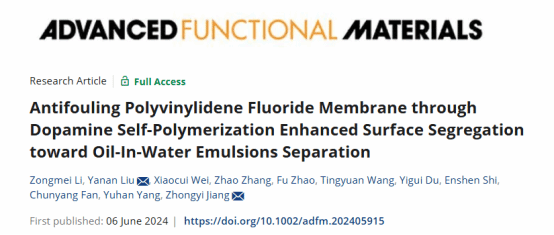 为了解决这一问题,bevictor1946韦德官网姜忠义教授团队设计将小分子多巴胺(DA)作为表面偏析剂,将其掺入聚偏氟乙烯(PVDF)基体中,采用非溶剂诱导相分离法制备抗污染膜,用于油水乳化液分离。该研究为利用小分子作为表面偏析剂制备抗污染膜开辟了一条新的途径。相关工作以“Antifouling Polyvinylidene Fluoride Membrane through Dopamine Self-Polymerization Enhanced Surface Segregation toward Oil-In-Water Emulsions Separation”发表在《Advanced Functional Materials》上。