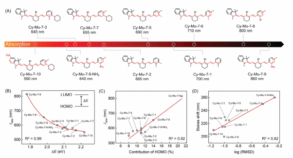 基于此,研究团队开发了系列不对称花菁染料(Cy-Mu-7 系列),其吸收波长在590 nm到860 nm之间可调,并且具有近红外区的荧光发射。计算化学揭示染料的吸收波长与其基本能隙成指数关系,与不对称基团对HOMO轨道的贡献成线性关系,染料的斯托克斯位移与基态构型和激发态构型的差成线性关系。重要的是氨基改性染料Cy-Mu-7-9-NH2在PBS中显示出800 nm的荧光发射,能够在口服给药后通过体内的光热反应诱导肠道上皮细胞中的HSP70表达,进而实现IBD的非破坏性治疗。通过光热效应和荧光成像的协同作用,研究首次实现了IBD的体内诊疗效果评估。