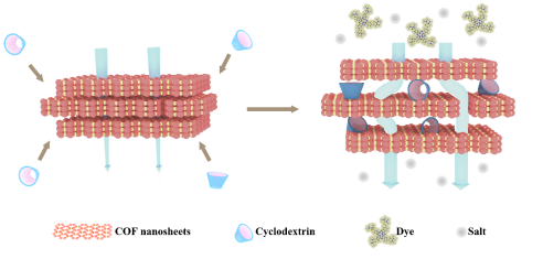 为了解决这一问题,bevictor1946韦德官网姜忠义教授团队将环糊精(CD)作为插层剂,引入相邻的COF纳米片中,以增加COF膜的层间距,形成丰富的传质通道,从而实现高效的染料和盐分离(图1)。此外,CD与COF纳米片之间的相互作用可以增强膜在长期测试中的稳定性。